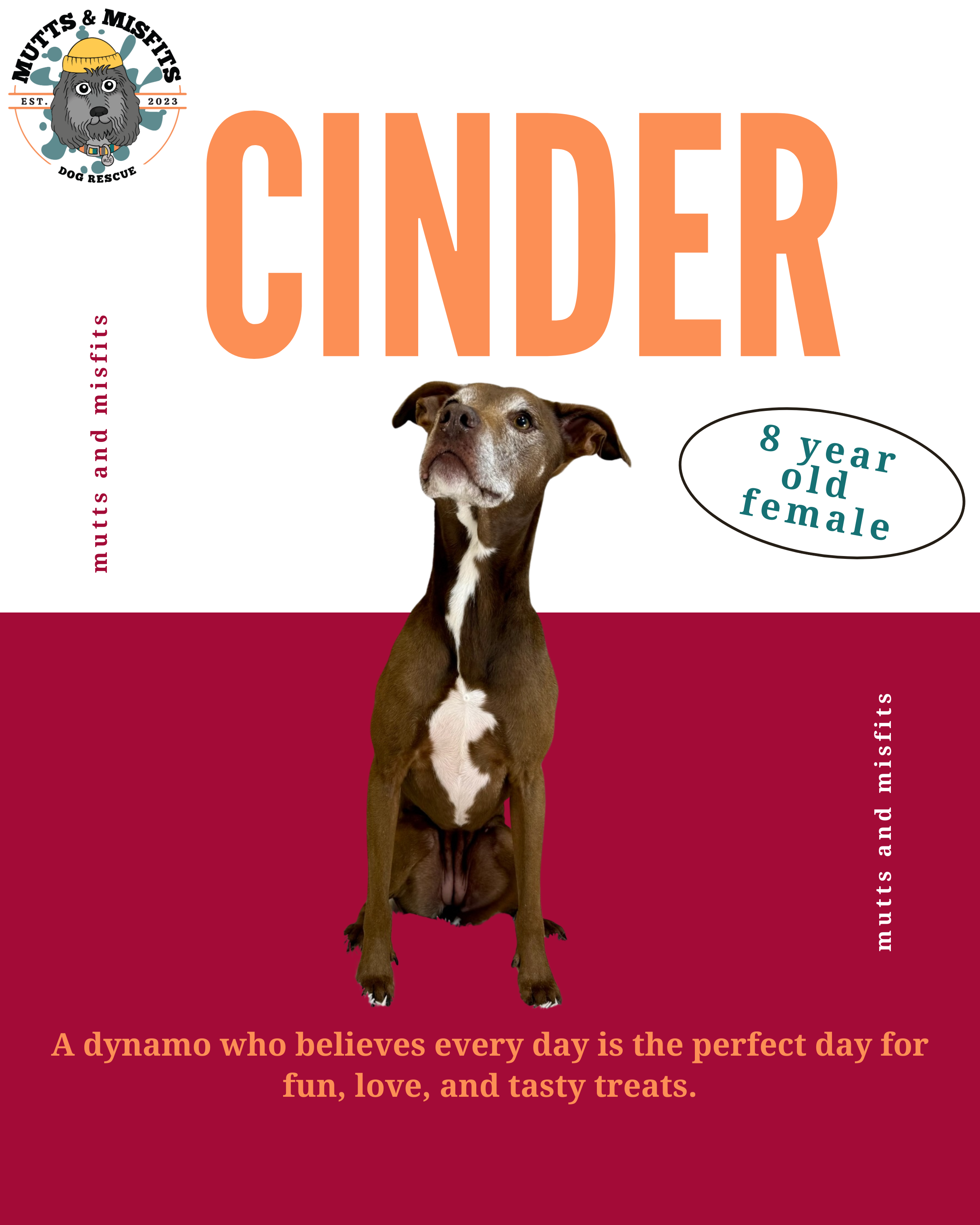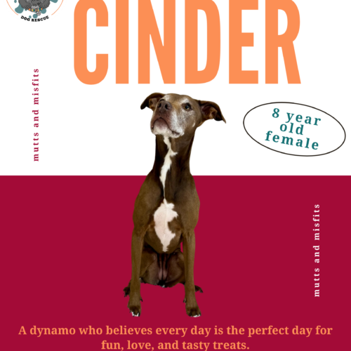 This young-at-heart lady is a bundle of joy! Cinder loves to run, play, and embark on exciting adventures. At just 8 years young, she keeps up with dogs half her age and is always ready for a yummy treat. Cinder is eager to find her forever home, where she can shower her new family with unconditional love. Could you be the one to give her the adventure she craves?